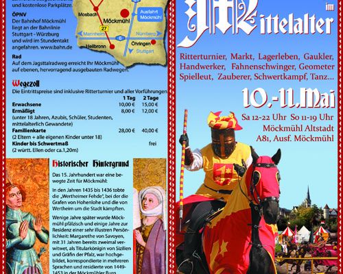 Die Stadt Möckmühl feiert ihre Vergangenheit alle drei Jahre in großem Rahmen: Markttreiben mit Handwerkern, Spielleuten und Gauklern in der verwinkelten Fachwerkaltstadt, Lagerleben, Schlachtenlärm und Turnierspannung auf den nahegelegenen Jagstauen.